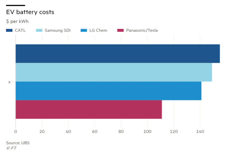 一個(gè)最具說(shuō)服力的數(shù)據(jù)是2018年11月瑞士聯(lián)合銀行(UBS)對(duì)松下、LG化學(xué)、三星SDI和寧德時(shí)代的電池進(jìn)行測(cè)試評(píng)估,其中特斯拉超級(jí)工廠生產(chǎn)的松下電池成本是0.11美元/瓦時(shí)(約合人民幣0.76元/瓦時(shí)),遠(yuǎn)低于其他三家競(jìng)爭(zhēng)對(duì)手,其中寧德時(shí)代的電池成本約0.15美元/瓦時(shí)(約合人民幣1.03元/瓦時(shí)),在四家企業(yè)中成本最高。