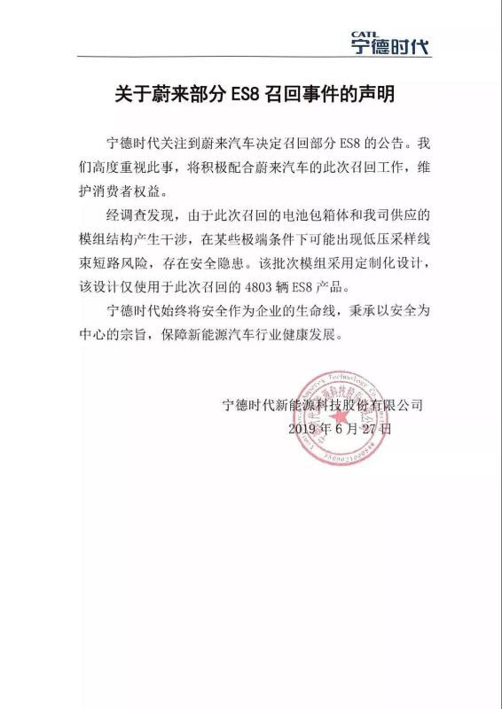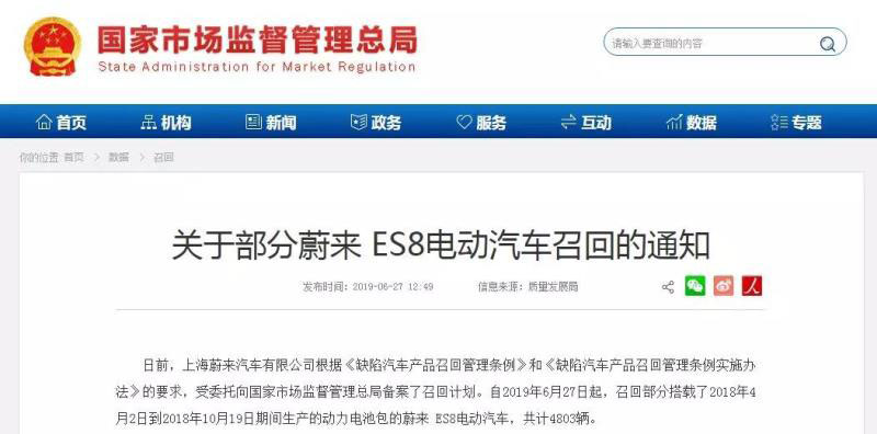 6月27日,國家市場(chǎng)監(jiān)督管理總局公告信息,上海蔚來汽車有限公司自即日起,主動(dòng)召回部分搭載了2018年4月2日到2018年10月19日期間生產(chǎn)的動(dòng)力電池包的蔚來ES8電動(dòng)汽車,共計(jì)4803輛。