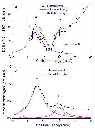 他們利用改進(jìn)的交叉分子束裝置,詳細(xì)測量了碰撞能1~35meV范圍內(nèi)的后向散射譜和微分截面。在這后向散射譜上,于碰撞能大約5meV的位置,觀測到了一個(gè)獨(dú)立的譜峰;而于20meV的位置,觀測到了輕微的振蕩。