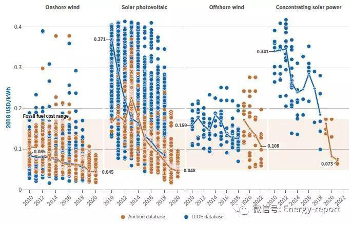 在當今世界大部分地區(qū),可再生能源已成為成本最低的電力來源。隨著太陽能和風能技術成本的持續(xù)下降,更多的國家將會出現(xiàn)這種情況。2010~2018年,生物質能、水電、地熱、陸上和海上風電的成本降至化石燃料發(fā)電成本以下,光伏發(fā)電是從2014年開始,全球加權平均電力成本下降到化石燃料發(fā)電成本以下。
