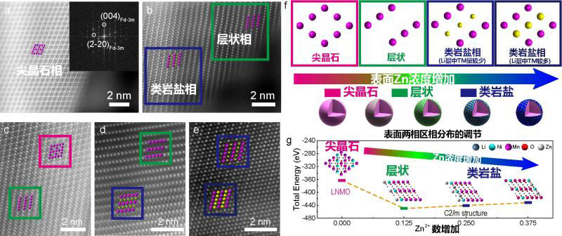 Zn2+促使尖晶石結(jié)構(gòu)表面產(chǎn)生相變:精確控制固相反應(yīng),獲得層狀和類巖鹽共存的表面兩相區(qū),基于相結(jié)構(gòu)和構(gòu)成的優(yōu)化提升電極材料的穩(wěn)定性