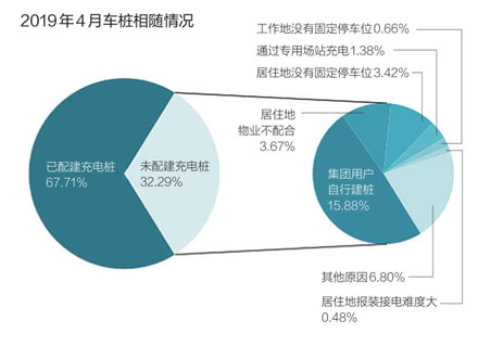 截止到2019年4月,通過充電聯(lián)盟成員內(nèi)整車企業(yè)采樣約82.96萬輛車的車樁相隨信息,發(fā)現(xiàn)建設(shè)安裝私人充電樁的有56.2萬輛,占67.71%;未隨車配建私人樁的有26.8萬輛,占32.29%,接近1/3。從未配建私人充電樁的原因看,除了集團用戶自行建樁占較高比例外,居住地物業(yè)不配合和居住地沒有固定停車位也是重要原因,這三個原因占比達71.1%,其余原因占比為28.9%。