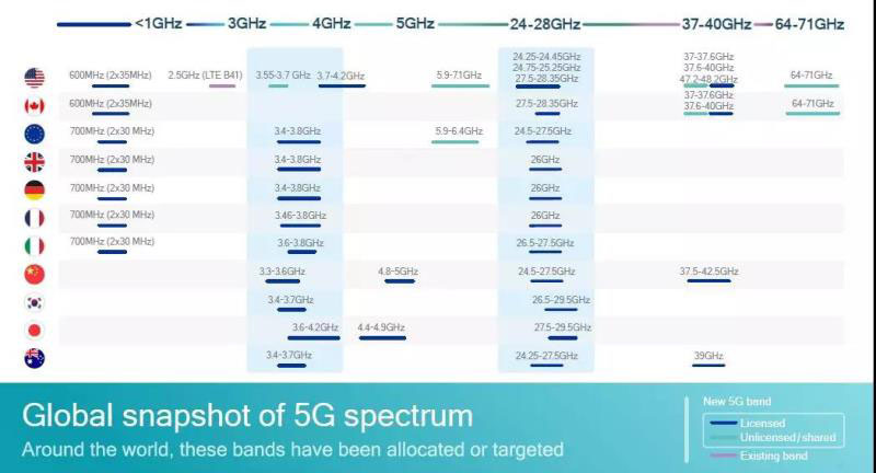 全球領(lǐng)域目前采用兩種方法部署數(shù)百兆赫的5G新頻譜。第一種的重心放在6GHz以下的電磁(EM)頻譜上(“低到中頻段頻譜”,也稱為“Sub-6”),主要在3GHz 和4 GHz頻段。第二種方法側(cè)重于24~300GHz之間的頻段(“高頻頻譜”或“毫米波”),這是目前美國(guó)、韓國(guó)和日本采用的方法(雖然三國(guó)也在不同程度上探索Sub-6頻段)。美國(guó)的運(yùn)營(yíng)商主要專注于5G的毫米波部署,因?yàn)槭澜缙渌貐^(qū)使用的5G的3GHz和4GHz頻譜大部分是美國(guó)獨(dú)有的聯(lián)邦頻段,特別是國(guó)防部廣泛使用的頻段。