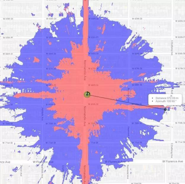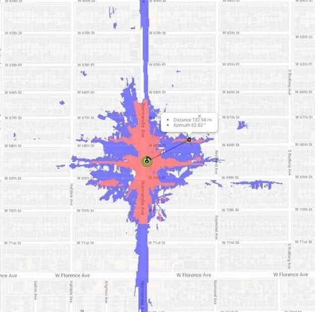 由于電線桿的易用性和豐富性,大多數(shù)運(yùn)營(yíng)商正考慮在電線桿上部署毫米波5G站點(diǎn)。利用美國(guó)的電線桿數(shù)據(jù)庫(kù)的研究表明,28GHz的毫米波基站需要大約在電線桿上安裝1300萬(wàn)個(gè),將花費(fèi)4000億美元,如此才能保證28GHz頻段下以每秒100 Mbps速度達(dá)到72%的覆蓋率、每秒1Gbps的速度達(dá)到大約55%的覆蓋率。下面的圖1和圖2顯示了28 GHz (毫米波)和3.4 GHz (Sub-6)在洛杉磯相對(duì)平坦的地區(qū)相同極點(diǎn)高度上部署的傳播差異(藍(lán)色表示100MBps的速度,紅色表示1GBps的速度):