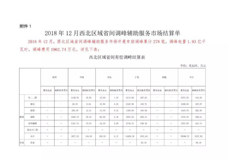2018年12月,西北區(qū)域省間調(diào)峰輔助服務市場開展有償調(diào)峰累計278筆,調(diào)峰電量1.93億千瓦時,調(diào)峰費用1962.74萬元;