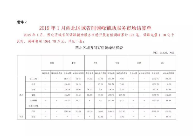 2019年1月,西北區(qū)域省間調(diào)峰輔助服務市場開展有償調(diào)峰累計171筆,調(diào)峰電量1.10億千瓦時,調(diào)峰費用1091.78萬元;