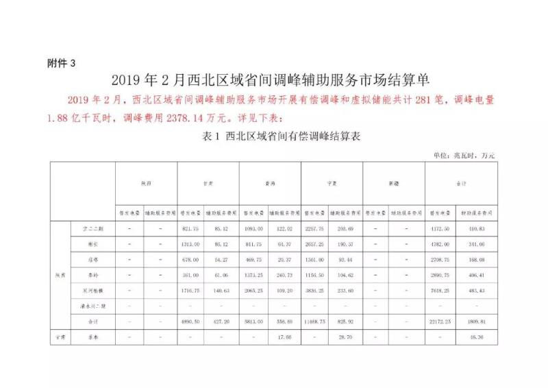 2019年2月,西北區(qū)域省間調(diào)峰輔助服務市場開展有償調(diào)峰和虛擬儲能共計281筆,調(diào)峰電量1.88億千瓦時,調(diào)峰費用2378.14萬元;