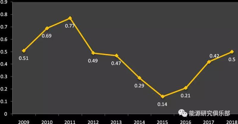 2011年我國能源消費(fèi)彈性系數(shù)為0.77,表明經(jīng)濟(jì)發(fā)展對能源消費(fèi)的依賴程度較高。2012年和2013年下降到0.5左右,2014年下降到0.29,2015年最終下降到0.14,2016年開始回升,2017年為0.42,2018年為0.5。需要注意經(jīng)濟(jì)增長與能源消費(fèi)之間的數(shù)據(jù)“背離”。