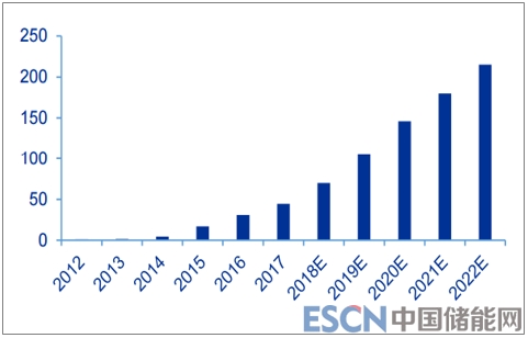 全球動(dòng)力電池需求量及預(yù)測(cè)(單位:GWh)