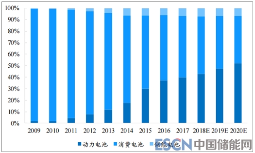全球鋰電池中動(dòng)力電池占比快速增長(zhǎng)