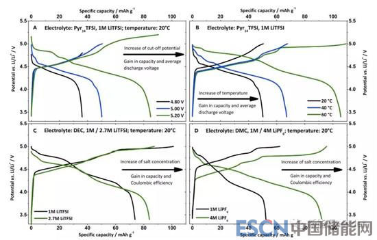 3)電解液作為活性物質(zhì),其陰離子的選擇,溶劑的選擇和添加劑的選擇都會(huì)對(duì)電池的工作電壓、容量等產(chǎn)生顯著的影響。