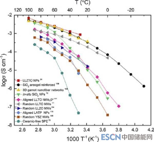 目前已廣泛的研究了納米粒子填充的CPEs。與具有粒子—粒子結的納米粒子不同,由于納米線表面上的連續(xù)和擴展的跳躍路徑,納米線可以構建用于快速鋰離子傳輸?shù)?D網(wǎng)絡。同時,二維(2D)中孔納米片如蒙脫石、粘土和云母也是高性能CPEs的填料。