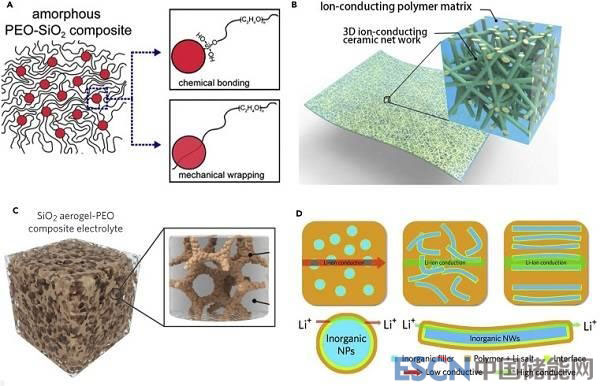 CSEs根據(jù)主要成分分為兩類:聚合物基質(zhì)(CPEs)和無機材料基質(zhì)。具有無機填料的SPEs的CPEs,通常顯示出更高的離子電導率、更好的機械性能和與電極的相容性。構建可結合有機和無機電解質(zhì)優(yōu)點的CPEs被認為是制造高性能的柔性電池的非常有前景的方法,同時增強機械性能有助于防止鋰枝晶生長以提高安全性。