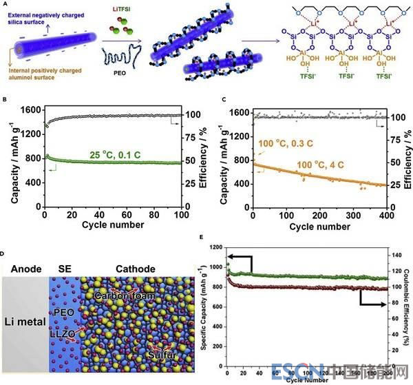 (A-C)示意圖顯示了HNT改性的柔性PEO CPEs的制備方法和HNT添加機理,用于在25 ℃(B)和100 ℃(C)下提高電池的離子電導率(A)和循環(huán)性能;