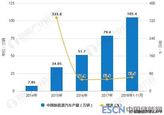2014-2018年1-11月中國(guó)新能源汽車產(chǎn)量統(tǒng)計(jì)及增長(zhǎng)情況
