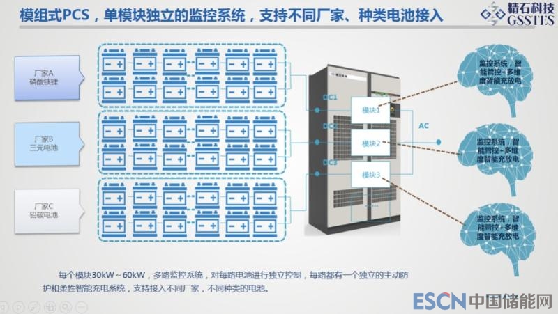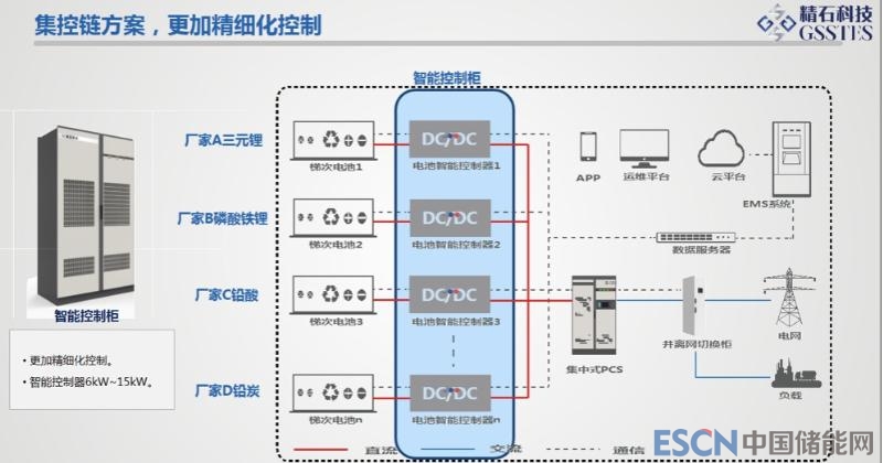 精石電氣集控鏈方案,每個(gè)電箱一對(duì)一精細(xì)化控制管理,有效延長電池壽命,提高系統(tǒng)效率,配套完善的監(jiān)控,快速發(fā)現(xiàn)問題;故障電池隔離,不影響整個(gè)系統(tǒng),可靠性高;電池更換方便,故障修復(fù)快;同時(shí),針對(duì)梯次電池,能夠避免拆包重組,大幅降低費(fèi)用。”西安精石電氣科技有限公司產(chǎn)品總監(jiān)劉衛(wèi)武先生在演講開始時(shí)便直接指出了影響度電成本的主要參量及對(duì)應(yīng)的優(yōu)化方向,提出西安精石集控鏈智慧儲(chǔ)能解決方案。