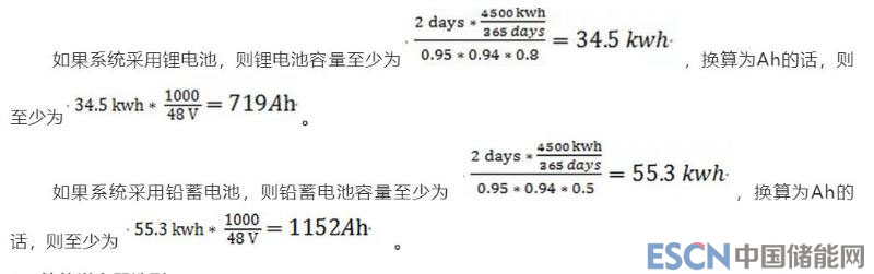 儲(chǔ)能電池容量方面,按照系統(tǒng)采用儲(chǔ)能電池作為唯一供電源可以支撐2天時(shí)間來進(jìn)行考慮。儲(chǔ)能電池的放電效率取0.95,儲(chǔ)能逆變器的效率取0.94;為了更好的保護(hù)電池,鋰電池的放電深度DOD取80%,鉛蓄電池的放電深度DOD取50%。