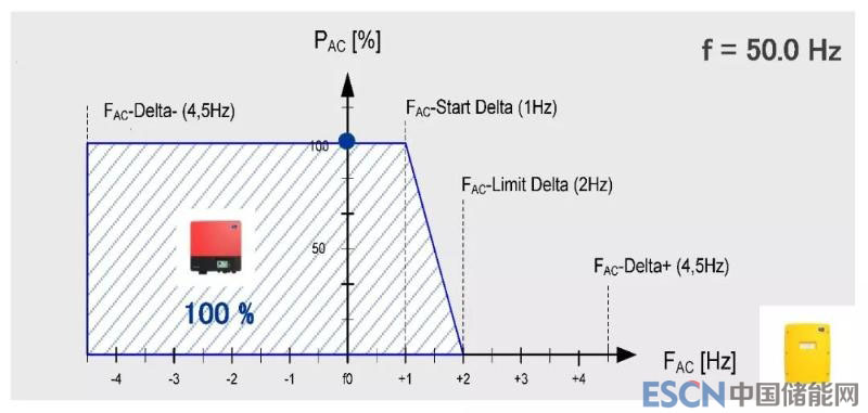 Sunny Island還具備調(diào)頻降載功能,避免電池過充。當(dāng)日照充足,光伏發(fā)電大于負(fù)載消耗且電池已充滿的情況下,Sunny Island會(huì)按照下圖曲線調(diào)整電網(wǎng)的頻率以減少PV光伏逆變器的輸出,避免過量充電而損耗電池。