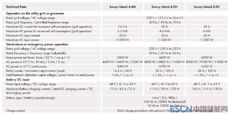 Sunny Island系列有三個(gè)型號(hào),Sunny Island 4.4M/6.0H/8.0H。以Sunny Island 8.0H 為例,其額定功率為6KW, 25℃下可以持續(xù)30min輸出8KW功率。其主要技術(shù)參數(shù)如下表: