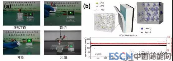 圖5 全固態(tài)鋰電池(a)安全性能演示和(b)長(zhǎng)循環(huán)性能