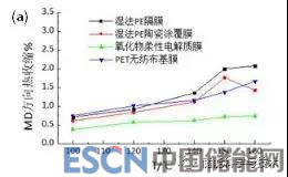圖2 無(wú)機(jī)固體氧化物柔性電解質(zhì)膜與傳統(tǒng)隔膜不同高溫下(a)MD方向和(b)TD方向收縮性對(duì)比曲線