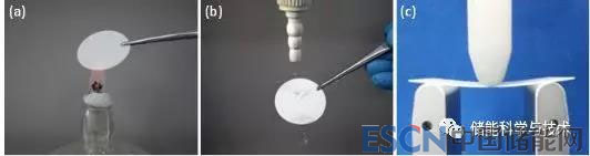 圖1 無(wú)機(jī)固體氧化物電解質(zhì)火燒(a)、水洗(b)和外力擠壓(c)安全性測(cè)試