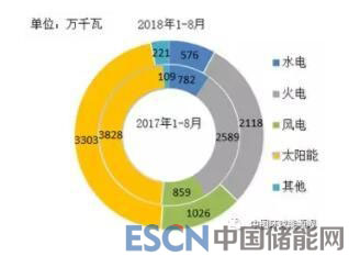 1-8月,全國電源新增生產(chǎn)能力(正式投產(chǎn))7254萬千瓦,較上年同期少投產(chǎn)913萬千瓦,同比下降11.2%。其中水電576萬千瓦,較上年同期少投產(chǎn)207萬千瓦,同比下降26.4%;火電2118萬千瓦,較上年同期少投產(chǎn)470萬千瓦,同比下降18.2%;核電新增221萬千瓦,較上年同期多投產(chǎn)113萬千瓦;風(fēng)電1026萬千瓦,較上年同期多投產(chǎn)167萬千瓦,同比增長19.4%;太陽能發(fā)電3303萬千瓦,較上年同期少投產(chǎn)525萬千瓦,同比下降13.7%。