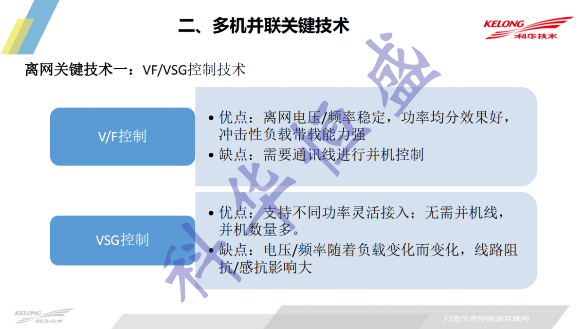 下面介紹一下并機(jī)技術(shù)。科華主要從三個(gè)方面介紹這一塊。并網(wǎng)方面,科華主要有三個(gè)點(diǎn),對(duì)電網(wǎng)的大規(guī)模應(yīng)用會(huì)比較突出的一個(gè)點(diǎn),就是多機(jī)并聯(lián)的穩(wěn)定性,還有高、低頻環(huán)流,還有系統(tǒng)響應(yīng)性,離網(wǎng)功能的話也是它很重要的一個(gè)功能,主要是VF/VSG技術(shù)的探討,還有離網(wǎng)的黑啟動(dòng),還有抗沖擊能力、電池平衡管理。