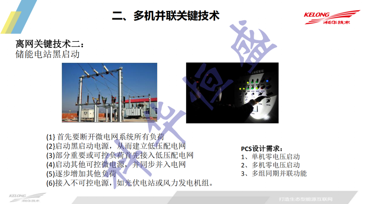 離網(wǎng)的黑啟動(dòng),在我們電力系統(tǒng)上面非常的關(guān)鍵,一旦電網(wǎng)停電了,整個(gè)系統(tǒng)就起不來(lái)了,儲(chǔ)能是不是可以起到有益的作用,這一點(diǎn)我覺(jué)得可以,它起到什么作用,就具備我們單機(jī)設(shè)備的零電壓?jiǎn)?dòng),還有整個(gè)儲(chǔ)能系統(tǒng)分布在好幾個(gè)單元,多個(gè)單元會(huì)同時(shí)啟動(dòng),同時(shí)啟動(dòng)完了以后要有同期并聯(lián)的功能,所以這兩三點(diǎn)是我們PCS或者多機(jī)并聯(lián)系統(tǒng)上面要具備的功能,才能實(shí)現(xiàn)一個(gè)大規(guī)模的黑啟動(dòng)。
