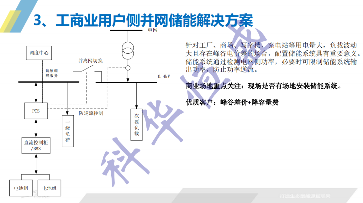 最后介紹一下我們并機(jī)的專利技術(shù),并機(jī)在我們公司是比較早已經(jīng)具備這個(gè)能力,而且是國(guó)內(nèi)首家具備這種能力的公司,在2004年的時(shí)候,我們創(chuàng)始人就已經(jīng)申請(qǐng)這么一個(gè)專利并聯(lián)技術(shù),所以我們?cè)趦?chǔ)能并聯(lián)系統(tǒng)上的一個(gè)優(yōu)勢(shì)還是比較突出的。接下來(lái)簡(jiǎn)單介紹一下應(yīng)用方案和案例,這是調(diào)峰調(diào)頻的解決方案,主要是補(bǔ)償原有的一個(gè)發(fā)電機(jī)組的控制、相應(yīng)速度慢的問(wèn)題,由前面的藍(lán)色通過(guò)加入儲(chǔ)能后變成后面紅色的這么一個(gè)波形。還有計(jì)劃性的解決方案也可以儲(chǔ)能系統(tǒng),平滑或者再利用光伏新能源的能量。這是用戶側(cè)的儲(chǔ)能解決方案,這套系統(tǒng)可以實(shí)現(xiàn)并網(wǎng),也可以實(shí)現(xiàn)離網(wǎng),也可以實(shí)現(xiàn)并離網(wǎng)切換。