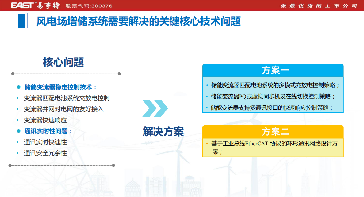 風(fēng)電上的儲(chǔ)能目前是比較熱的,我們針對(duì)690伏的系統(tǒng)解決方案,主打的配置是目前研究的一兆瓦的儲(chǔ)能變流器。風(fēng)電廠儲(chǔ)能不管是變流器控制還是其他的方案都是比較成熟的,從我們的角度來(lái)看有幾個(gè)方面需要解決。一是變流器和電池系統(tǒng)的匹配問(wèn)題,二是變流器并網(wǎng)對(duì)電網(wǎng)的影響沖擊是最小,三是調(diào)動(dòng)實(shí)時(shí)性問(wèn)題,要快速的響應(yīng)。針對(duì)這些問(wèn)題我們提出兩個(gè)解決方案,一是儲(chǔ)能變流器匹配電池系統(tǒng)的多模式充放電控制策略,儲(chǔ)能變流器PQ或虛擬同步機(jī)及在線切換控制策略,儲(chǔ)能變流器支持多通訊接口的快速響應(yīng)控制策略。二是基于工業(yè)總線EtherCAT協(xié)議的環(huán)行通訊網(wǎng)絡(luò)方案。