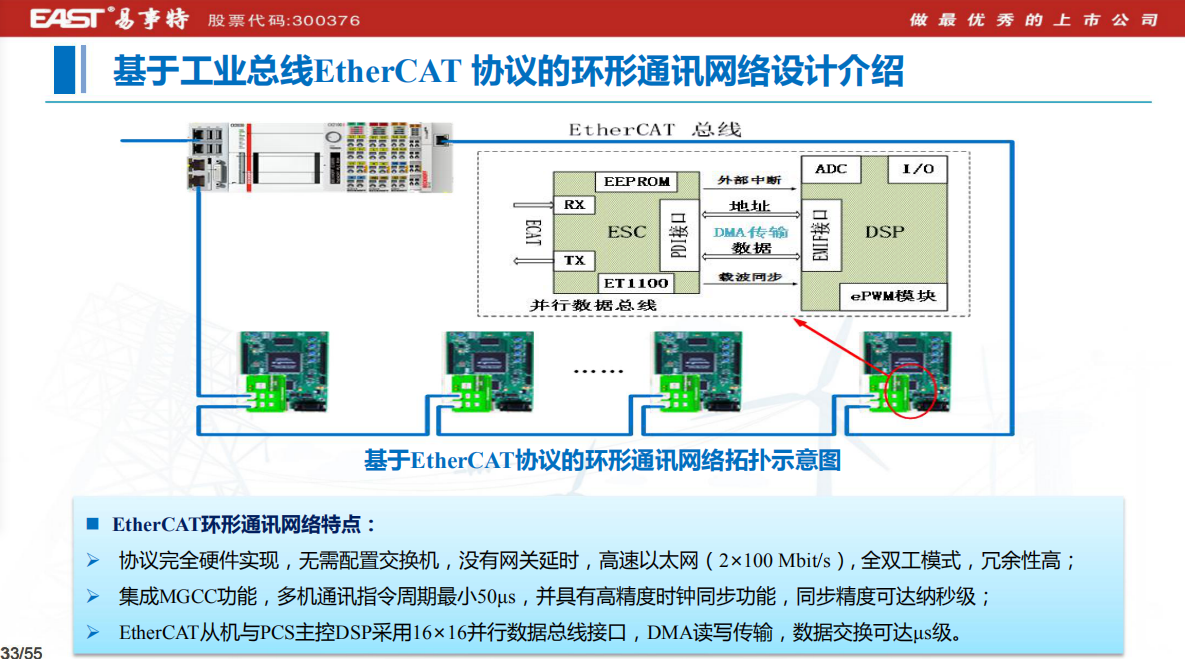 基于工業(yè)總線EtherCAT協(xié)議的環(huán)行通訊網(wǎng)絡(luò)設(shè)計(jì),協(xié)議完全硬件實(shí)現(xiàn),無(wú)需配置交換機(jī),沒(méi)有網(wǎng)關(guān)延時(shí),高速以大網(wǎng)、全雙工模式,冗余性高。并且有高精度時(shí)鐘同步功能,同步精度可達(dá)納秒級(jí)。我發(fā)一個(gè)指令變流器接收到以后響應(yīng)的時(shí)間有多少呢?這對(duì)于風(fēng)電廠的運(yùn)營(yíng)單位是比較關(guān)心的,0.11秒就可以達(dá)到,這是我們測(cè)試的結(jié)果。