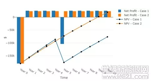 圖4.兩個(gè)項(xiàng)目的現(xiàn)金流量。藍(lán)色線條表示采用一種更積極的策略,沒(méi)有考慮退化,但獲得更多收入。橙色線條表示采用了更為保守的策略,可以減少退化。