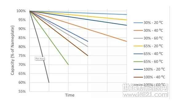 圖2.鋰離子電池在平均充電狀態(tài)和溫度不同組合下的容量降低情況。例如,綠色線段顯示電池工作在65%充電狀態(tài)和60°C時(shí)的性能下降情況