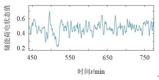 以儲(chǔ)能在整個(gè)調(diào)頻時(shí)間內(nèi)的荷電狀態(tài)值SOC驗(yàn)證儲(chǔ)能容量配置的合理性。某一時(shí)刻的SOC變化如圖10所示,可見(jiàn)該時(shí)刻SOC值在0.2~0.7范圍內(nèi)波動(dòng),滿足SOC∈[0.2,0.8]。