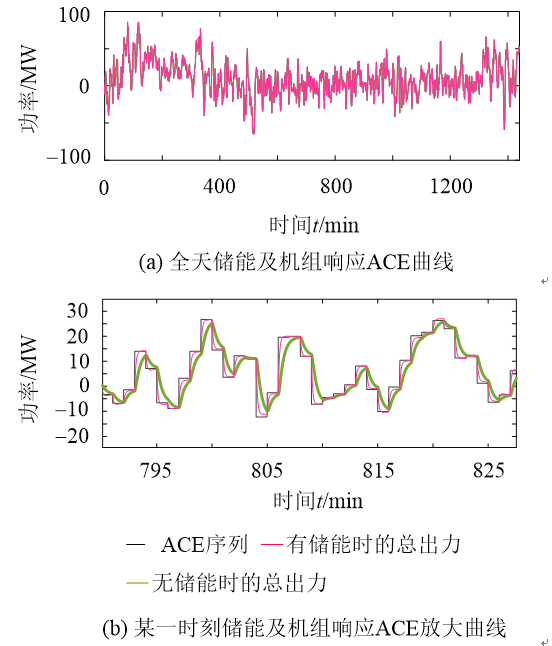 以表1和表3中的參數(shù)搭建仿真模型,全天的ACE信號(hào)及火電機(jī)組和儲(chǔ)能的出力曲線如圖9(a)所示,某時(shí)刻局部放大圖如圖9(b)所示,其中黑線為ACE信號(hào)曲線,指令周期為1min,紅線為加入儲(chǔ)能后火-儲(chǔ)聯(lián)合出力,綠線表示無(wú)儲(chǔ)能時(shí)火電機(jī)組的總出力。由圖9可見(jiàn),儲(chǔ)能輔助火電機(jī)組參與ACE調(diào)節(jié)之后,調(diào)節(jié)速度明顯變快、調(diào)節(jié)偏差明顯減小,響應(yīng)更加迅速。