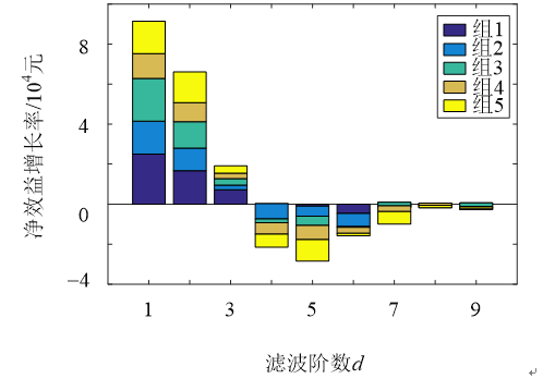 本文基于EEMD方法分解ACE信號(hào),基于凈效益期望最大選擇最優(yōu)濾波階數(shù),實(shí)現(xiàn)AGC過(guò)程中火-儲(chǔ)聯(lián)合調(diào)度調(diào)頻儲(chǔ)能容量?jī)?yōu)化配置。該方法在彌補(bǔ)傳統(tǒng)分解手段不足的基礎(chǔ)上,能同時(shí)滿足調(diào)節(jié)效果和經(jīng)濟(jì)性的要求。算例結(jié)果表明,濾波階數(shù)越大調(diào)頻效果越好,但儲(chǔ)能建設(shè)費(fèi)用過(guò)高,儲(chǔ)能系統(tǒng)利用率降低;而濾波階數(shù)設(shè)置過(guò)小,則達(dá)不到所需調(diào)頻效果;濾波階數(shù)的選擇與系統(tǒng)的歷史ACE波動(dòng)性和電網(wǎng)調(diào)頻機(jī)組性能密切相關(guān),需要根據(jù)不同的電網(wǎng)分別進(jìn)行估算,不存在固定值。