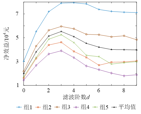 圖7為5組數(shù)據(jù)不同d值下的凈效益曲線,其中黑色曲線代表每個(gè)d值下5組ACE數(shù)據(jù)凈效益期望的平均值??梢?jiàn)當(dāng)d=3時(shí),所得到的凈效益期望均值最大,為5.5萬(wàn)元。