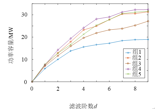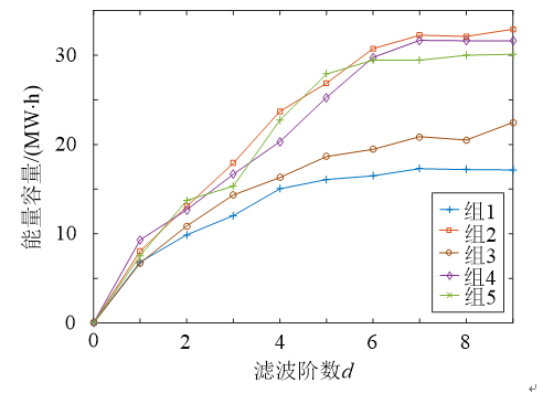 在儲(chǔ)能對(duì)頻率較高的調(diào)頻功率進(jìn)行調(diào)節(jié)的過(guò)程中,可以確定其所需功率容量和能量容量,分別求出5組數(shù)據(jù)在不同濾波階數(shù)下對(duì)應(yīng)的儲(chǔ)能功率容量和能量容量如圖5和圖6所示。