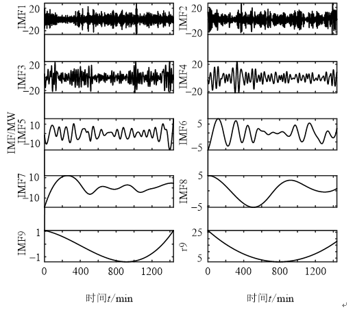 集合經(jīng)驗(yàn)?zāi)B(tài)分解(ensemble EMD,EEMD)提出一種噪聲輔助數(shù)據(jù)分析方法,通過(guò)向待分解信號(hào)多次添加均勻白噪聲再濾除的方法,可以在減小模態(tài)混疊現(xiàn)象的同時(shí),得到更加準(zhǔn)確的IMF分量。采用EEMD方法將ACE信號(hào)中真實(shí)存在的不同時(shí)間尺度或趨勢(shì)的分量逐級(jí)分解出來(lái),產(chǎn)生一系列具有相同時(shí)間尺度的數(shù)據(jù)序列,分解后的ACE序列與原始ACE序列相比具有更強(qiáng)的規(guī)律性和可處理性。