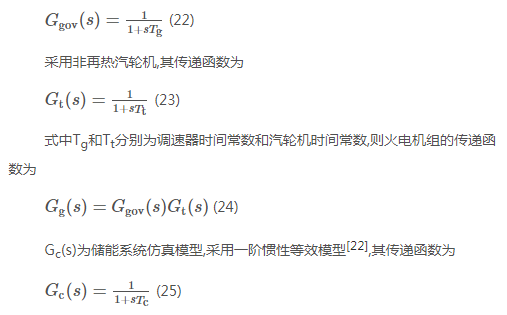 圖1中:PG_out為火電機(jī)組出力;PS_out為儲(chǔ)能系統(tǒng)出力;ΔPtie為聯(lián)絡(luò)線功率偏差;Gg(s)為火電機(jī)組動(dòng)態(tài)特性低階模型,可用于電力系統(tǒng)頻率分析與控制,模型忽略了鍋爐的慢特性與發(fā)電機(jī)的快速動(dòng)態(tài)特性,由調(diào)速器模型和汽輪機(jī)模型串聯(lián)構(gòu)成,火電機(jī)組調(diào)速器的傳遞函數(shù)為[21]