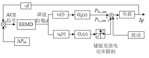 對(duì)電網(wǎng)歷史ACE數(shù)據(jù)的統(tǒng)計(jì)分析可根據(jù)電網(wǎng)運(yùn)行方式及波動(dòng)特性,將全年的電網(wǎng)ACE數(shù)據(jù)分為幾種典型日,在每一種典型日下,基于EEMD方法對(duì)ACE信號(hào)分解,得到一系列IMF分量,每個(gè)IMF分量可以表征原始ACE信號(hào)在其對(duì)應(yīng)的某一時(shí)間尺度參數(shù)上的模態(tài),即不同類型的擾動(dòng)造成的電網(wǎng)功率波動(dòng)。借助IMF分量構(gòu)造時(shí)空濾波器,通過(guò)選取合適的濾波階數(shù)d,可以將原始ACE功率信號(hào)分解成兩部分,階數(shù)小于等于d的IMF分量之和為頻率較高的部分,由儲(chǔ)能承擔(dān);階數(shù)大于d的IMF分量之和為頻率較低的部分,由火電機(jī)組承擔(dān)。
