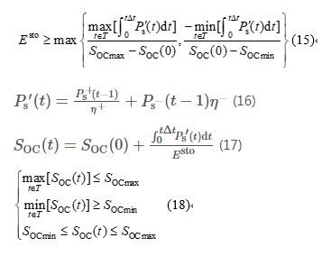 式(15)中:P's(t)為考慮充放電效率后儲(chǔ)能的實(shí)際動(dòng)作指令,可由公式(16)計(jì)算;SOC為儲(chǔ)能系統(tǒng)的荷電狀態(tài),且滿足公式(17)(18);SOCmax和SOCmin分別為荷電狀態(tài)的上、下限;SOC(0)和SOC(t)分別為0時(shí)刻和t時(shí)刻儲(chǔ)能系統(tǒng)的荷電狀態(tài)。