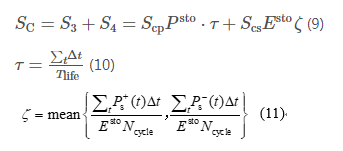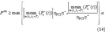 式中:Scp和Scs分別為儲(chǔ)能單位功率和單位能量的成本;τ和ζ分別為儲(chǔ)能PCS的使用率和儲(chǔ)能單元的使用率[10],分別由公式(10)(11)計(jì)算得出;Tlife為儲(chǔ)能裝置的壽命;Ncycle為儲(chǔ)能裝置的循環(huán)次數(shù);Psto、Esto分別為儲(chǔ)能系統(tǒng)參與調(diào)頻所需配置的功率容量和能量容量;Ps-(t)和Ps+(t)分別為t時(shí)刻儲(chǔ)能系統(tǒng)被分配的充、放電功率,且滿足: