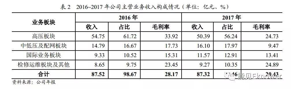 2017年,受原材料價格上漲與產(chǎn)品售價下降雙重因素影響,中低壓及配網(wǎng)板塊毛利率為9.47%,較上年下降8.26個百分點;國際業(yè)務(wù)板塊毛利率為13.41%, 較上年下降1.90個百分點;檢修運維板塊及其他毛利率為24.89%,較上年變化不大;受上述因素綜合影響,公司主營業(yè)務(wù)綜合毛利率下降7.74個百分點至20.43%。