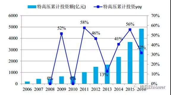 特高壓累計投資額在2012年之前年均復(fù)合增速在20%左右,2014年開始進入快速增長,2015年增速超過50%,增速見頂,2016年特高壓累計投資額增速同比下降超過20個百分點。