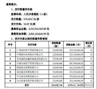 上述定增方案獲證監(jiān)會審核通過后,平高電氣股價最高一度沖至18.69元/股,此后便一蹶不振。據(jù)《北京時間》報道,平高電氣內(nèi)部對此輪定增預(yù)期底價是不低于18元/股,但面對持續(xù)下挫的股價,不得不做出妥協(xié)。此后根據(jù)市場表現(xiàn),最終增發(fā)價格為16.05元/股,發(fā)行數(shù)量219,435,736股,募集資金總額35.22億元。廣州金控資產(chǎn)管理有限公司、中國銀河證券股份有限公司等8家公司成為其發(fā)行對象。(調(diào)整后的定價基準(zhǔn)日為發(fā)行期首日-2016年10月19日。發(fā)行價格不低于定價基準(zhǔn)日前 20 個交易日公司股票交易均價的90%,也就是底價為16.00元。)