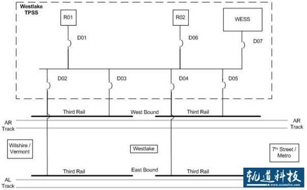 西湖/麥克阿瑟公園站的牽引變電站直流母線由兩個斷路器(CB)D01和D06供電,由兩個整流器R01和R02組成,直流母線連接四個饋線直流斷路器D02-D05,分別為東行(AL)和西行(AR)軌道列車供電。如圖1所示: