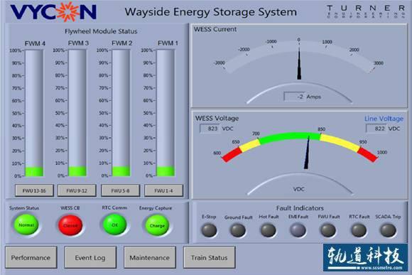 WESS安裝在牽引變電站中,通過一個獨(dú)立的斷路器D07連接至DC總線上,斷路器提供就地和遠(yuǎn)程控制以及過流和故障保護(hù),WESS通過由線路電感組成的EMI濾波器和每個FWU中的電容確保電路具有足夠的電磁*保護(hù)。FWM由WESS實(shí)時控制器(RTC)控制,RTC由工業(yè)處理器,模擬和數(shù)字輸入和輸出、網(wǎng)絡(luò)通信以及用戶界面的觸摸面板顯示器組成,RTC提供對WESS的控制、監(jiān)測及記錄。RTC監(jiān)測列車的制動和加速情況,然后命令FWM進(jìn)行充電和放電。WESS性能和狀態(tài)如圖2所示: