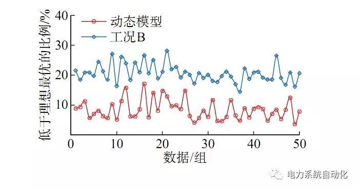 以預(yù)測曲線計算出動態(tài)效率模型和常數(shù)模型下的出力,在預(yù)測曲線上添加隨機(jī)誤差(本次分析重復(fù)50次),分析兩種模型下的日前優(yōu)化出力在添加誤差后的實(shí)際效果,其中基準(zhǔn)值為添加誤差后新曲線的最優(yōu)理想消納效果。由圖8可以看到,動態(tài)模型給出的出力計劃與理想最優(yōu)效果差距平均為8.49%,而以B工況的出力效果與理想最優(yōu)的差距平均為20.70%,在預(yù)測誤差的干擾下,動態(tài)模型消納效果受到的影響相對較小,這是動態(tài)模型下的儲能出力在較高的效率區(qū)域的緣故。